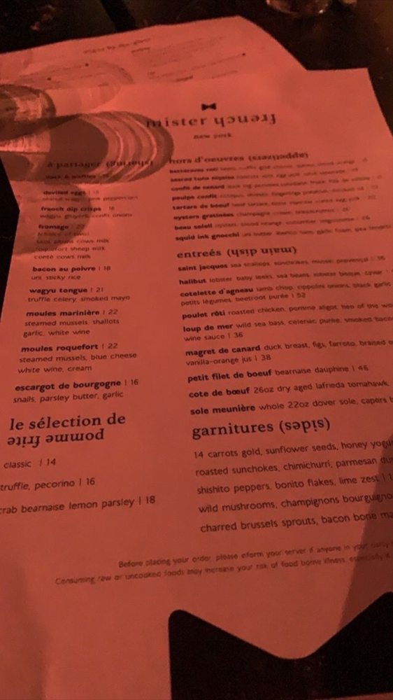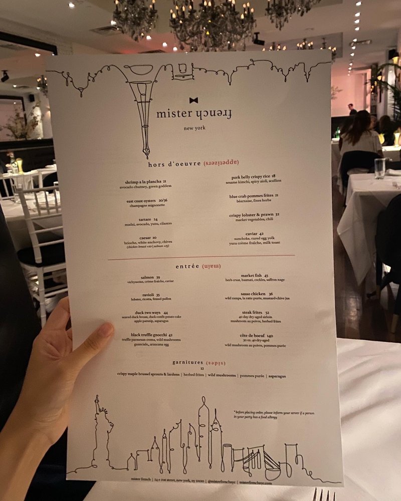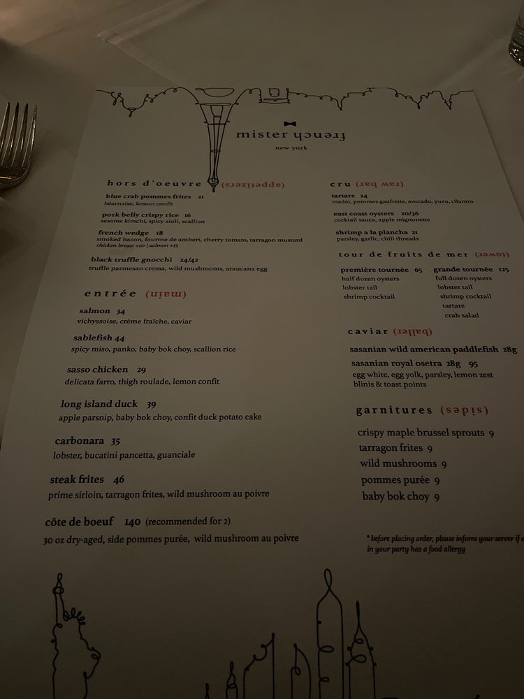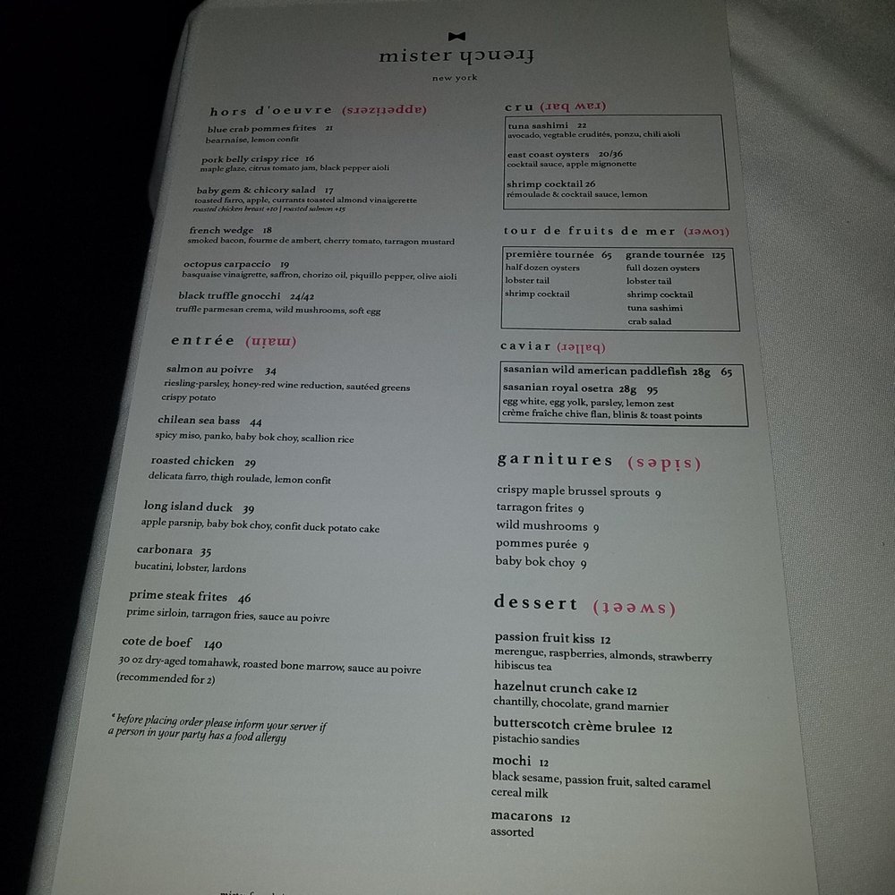 Introducing the menu at Mister French, a fusion of French, New American, and Asian cuisines located in New York City. The restaurant offers a classy yet welcoming atmosphere with outdoor seating and a full bar. Customers rave about the incredible dishes, particularly the burger and steak, which are described as out of this world delicious. Other highlights include the salmon crispy rice, Caesar salad, and halibut. The staff receives high praise for their exceptional service and attention to detail. The decor is stunning, with beautiful interior design and a romantic ambiance perfect for special occasions. Prices are on the higher end, but the quality of the food and overall experience make it worth it. Don't miss the opportunity to dine at Mister French for a memorable and delectable dining experience.